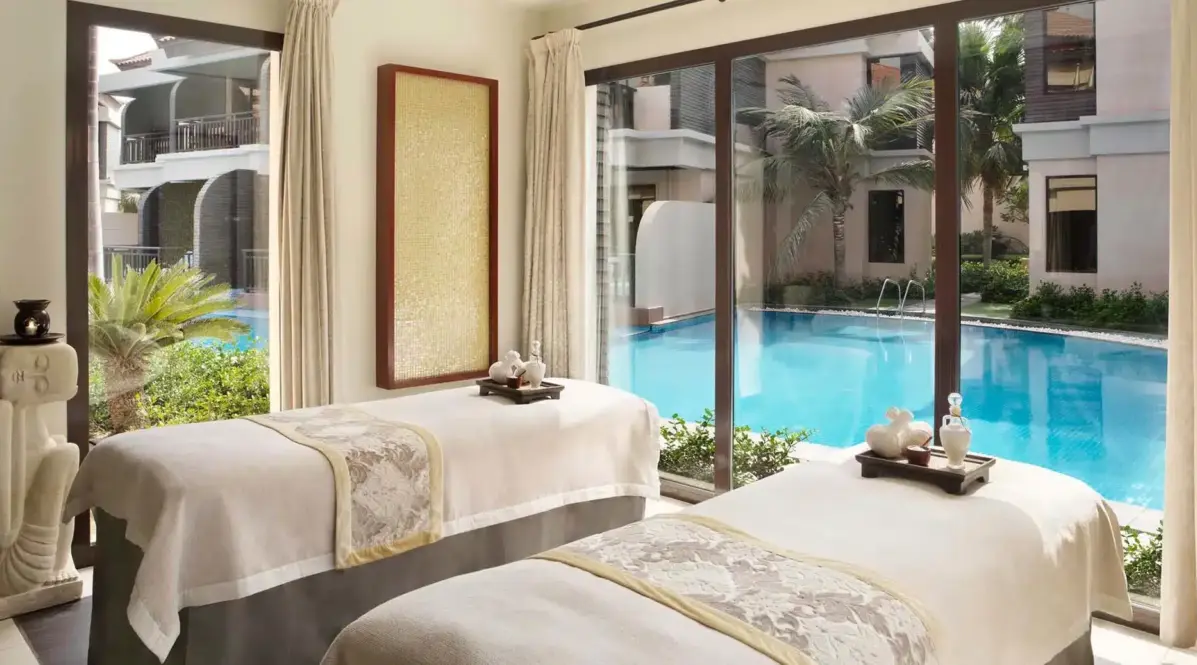 At Anantara Spa, guests enter an Asian-inspired sanctuary featuring 24 treatment rooms—including Thai‑massage suites, Ayurveda room, and over‑water couple villas—plus Turkish hammams (with separate male, female, and couple sections), a micro‑silk therapy pool, steam rooms, saunas, and a nail bar. Fitness enthusiasts can enjoy a fully equipped gym (Technogym), while also having access to watersports, yoga, and the resort’s lagoons for tranquil swims.