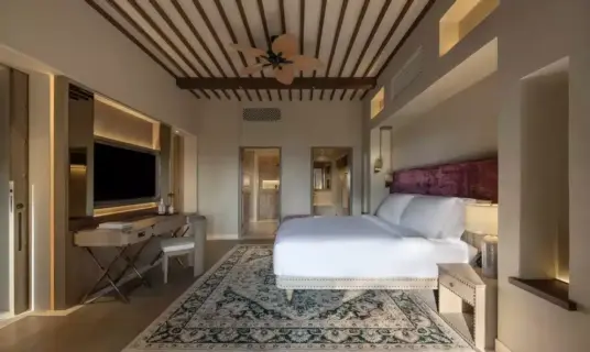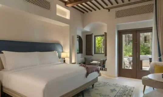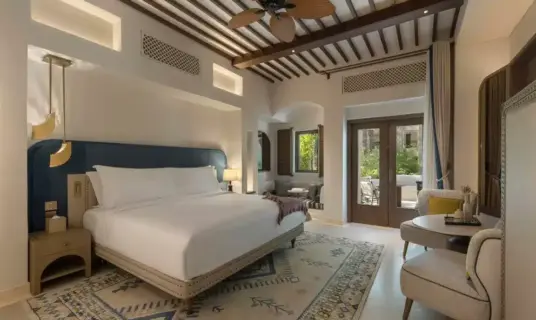 Bab Al Shams offers luxurious desert accommodations with traditional Arabian charm and modern comforts. Enjoy spacious rooms and suites featuring elegant decor, private balconies, and serene desert views. The resort’s rooms are designed for relaxation, with plush bedding, premium amenities, and beautifully appointed bathrooms for a truly indulgent stay.
