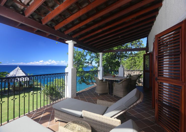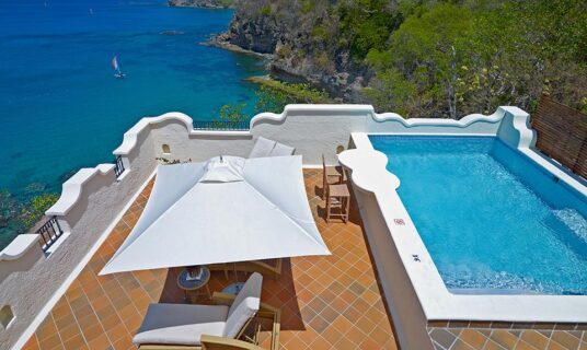 Situated overlooking the Naked Fisherman Beach and surrounded by beautiful tropical gardens, the views out to Martinique over the blue Caribbean Sea are spectacular. Large split-level suites, they come with a downstairs living/dining area with private verandah and upstairs a four posted king size bed, walk in wardrobe and an outside private whirlpool tub on the balcony.