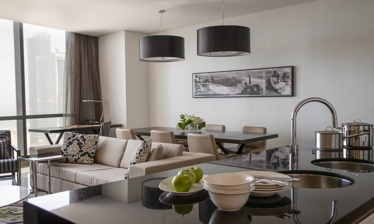 An one‑bedroom serviced residence with a queen bed, separate living and dining area, fully-equipped kitchen and partial sea view, ideal for two guests seeking apartment‑style comfort.