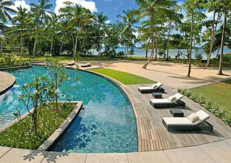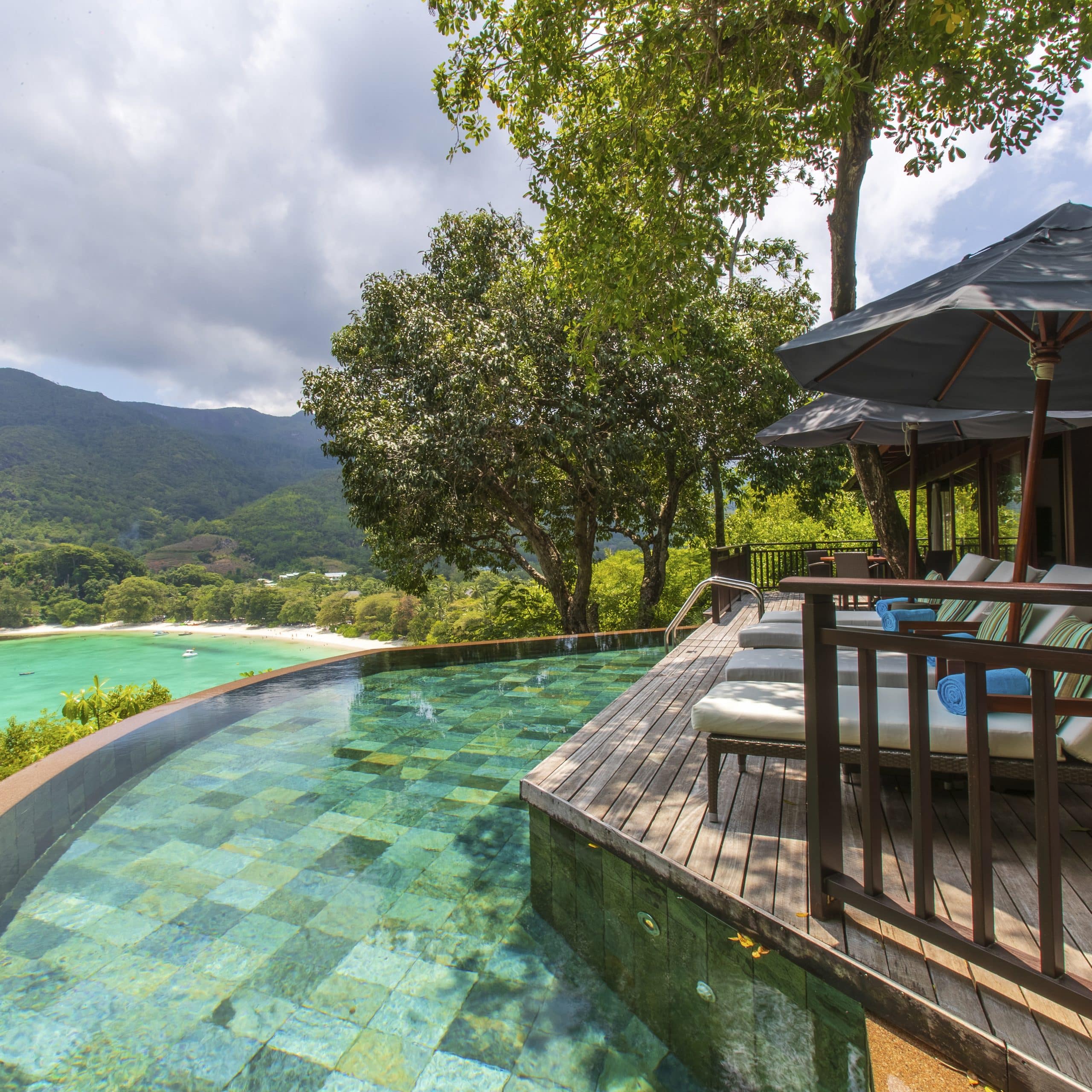 Villas built into granite hills with infinity pools and panoramic views over Port Launay Marine Park.