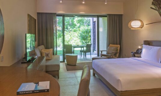 A roomy suite with a large bathroom, double vanity, and terrace overlooking the lagoon or beach.