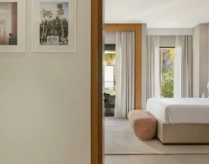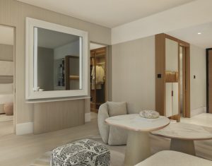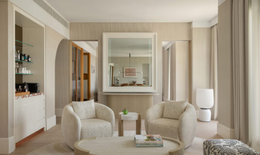 This elegantly modern suite flows seamlessly from a chic living and dining area with a convenient powder room to a peaceful bedroom sanctuary. Guests can relax outdoors on a private terrace with partial sea or pool views or unwind in the spa-like all-marble bathroom, complete with a soaking tub for ultimate relaxation