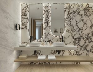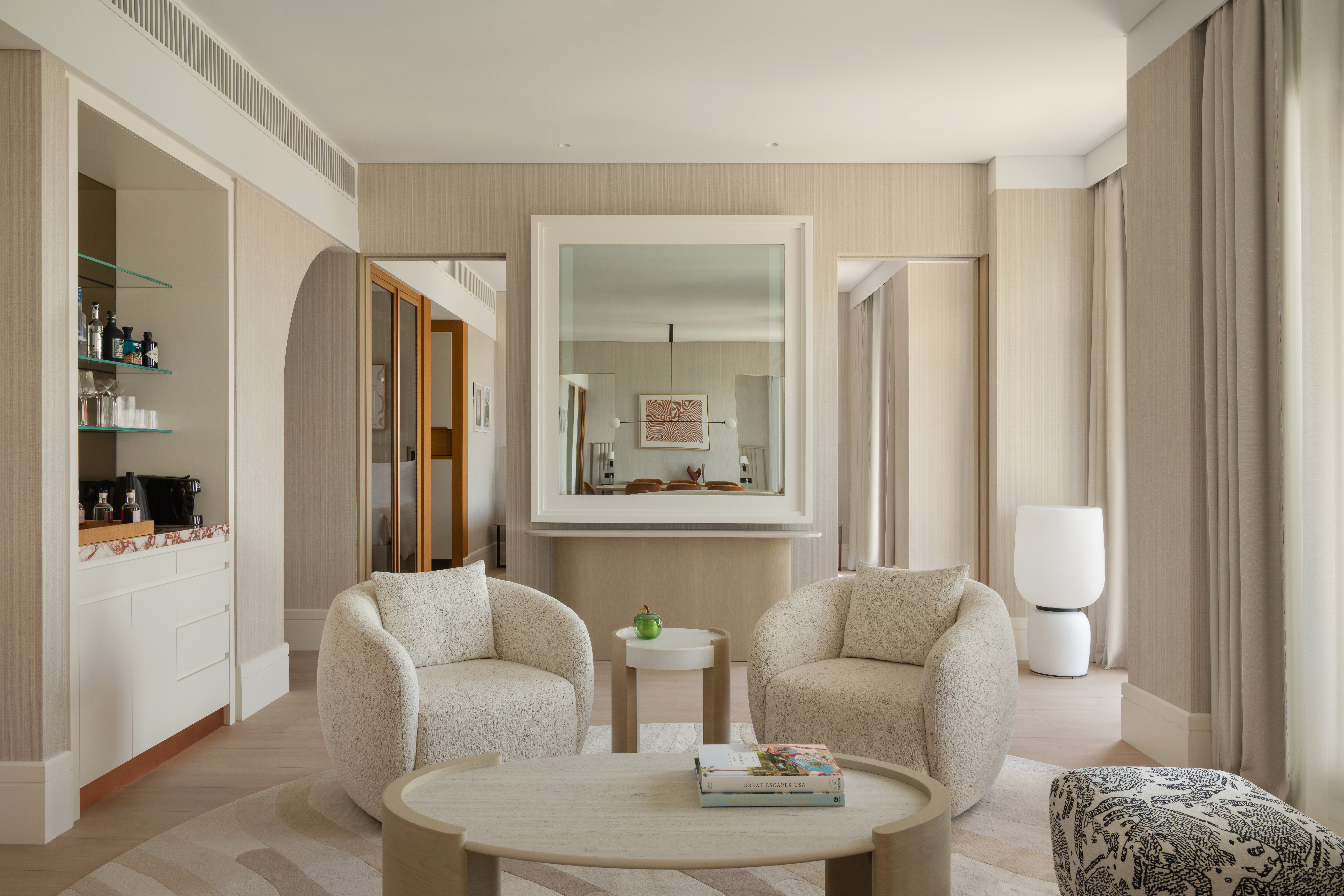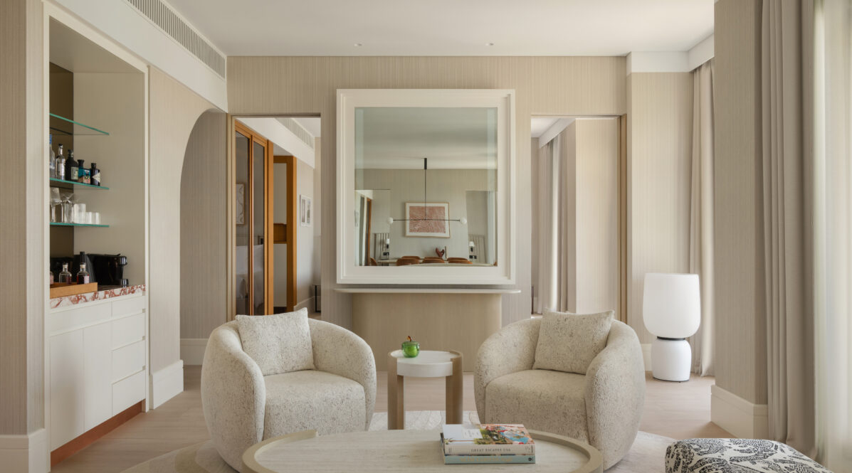 This suite captures sweeping sea views and features refined living and dining areas styled in gentle, flowing shapes that mirror the surrounding waters. The ensuite, enveloped in rich marble, brings an added sense of opulence and tranquillity to the space, offering a luxurious retreat for every guest