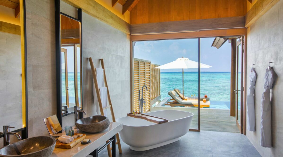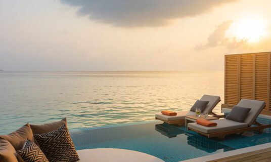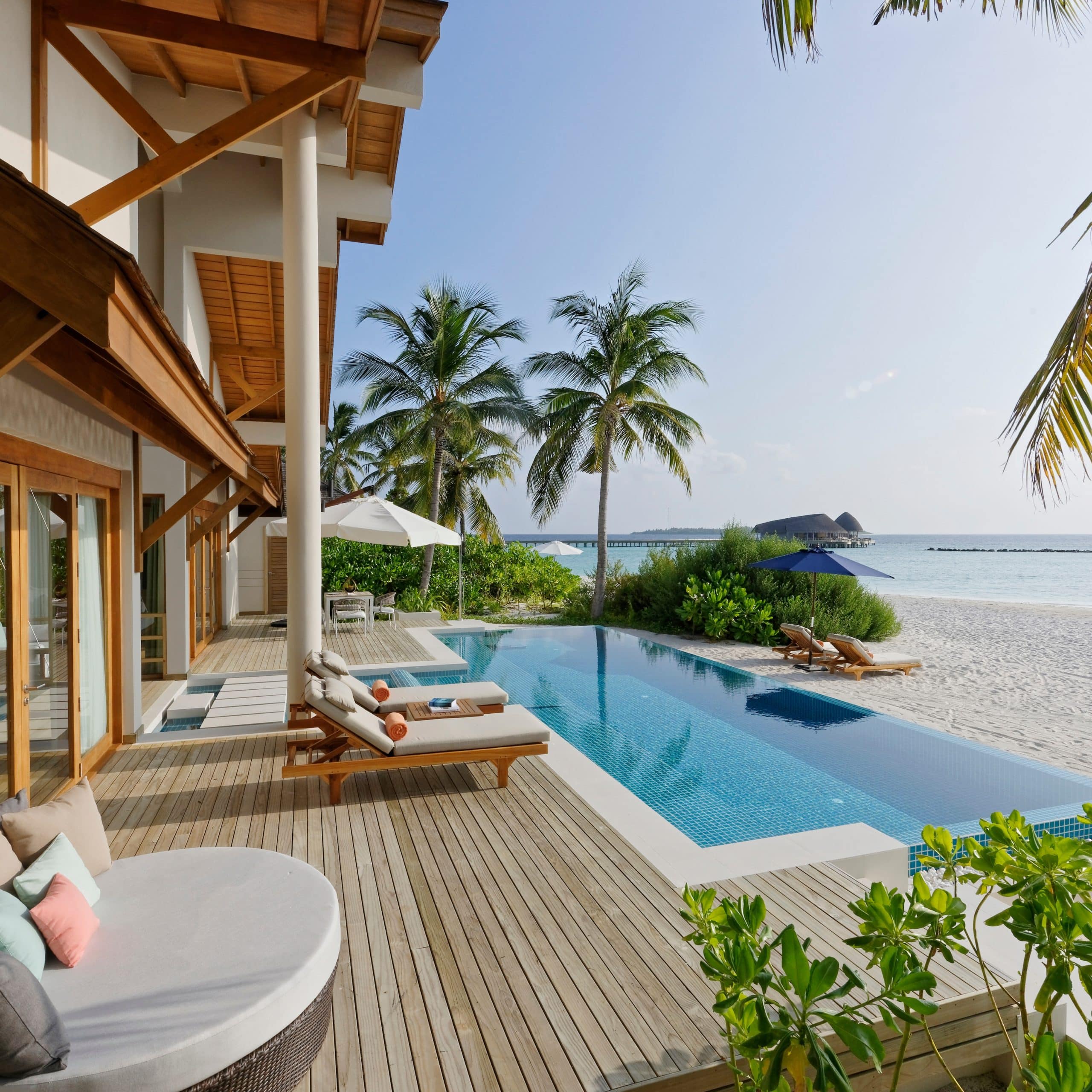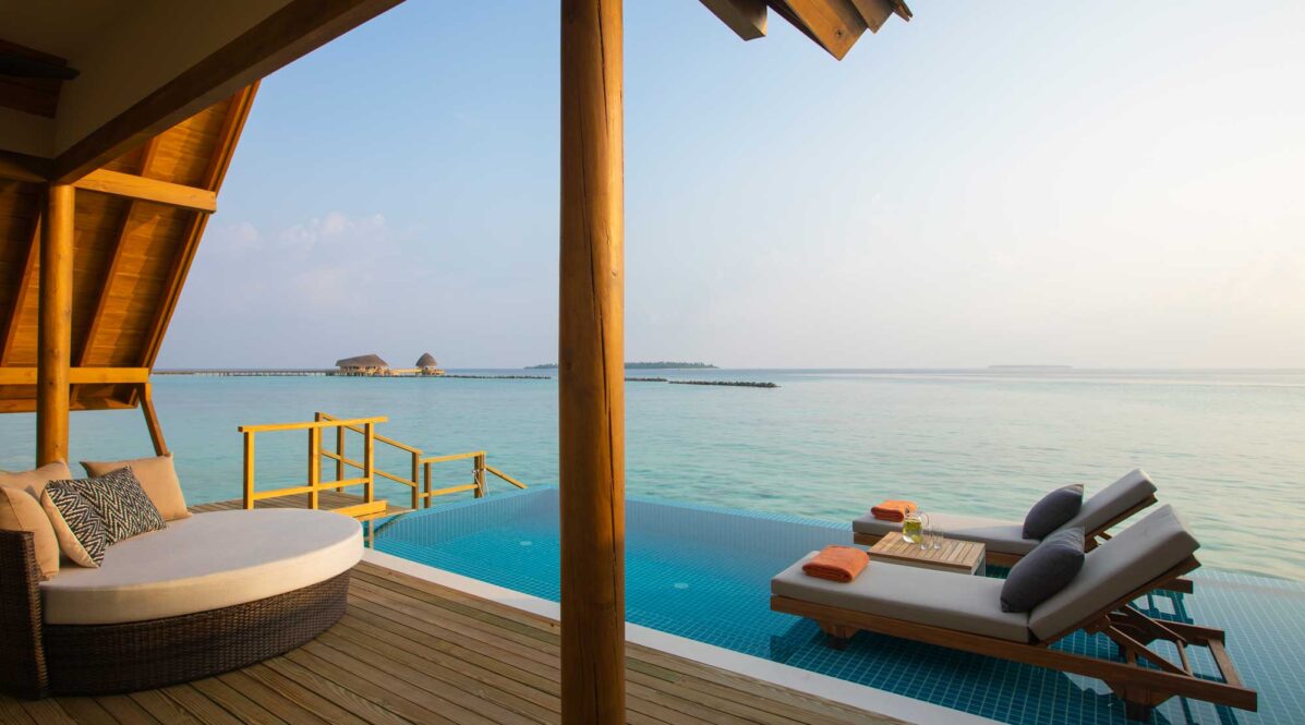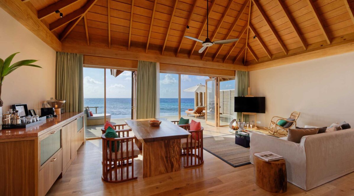 Perched above the lagoon’s western edge, these 172 m² villas feature a private 8 × 3 m infinity pool and open decks perfectly positioned for Maldivian sunsets. Designed with natural woods and glass for uninterrupted sea views, each offers direct lagoon access, spacious interiors, and a serene atmosphere ideal for couples.