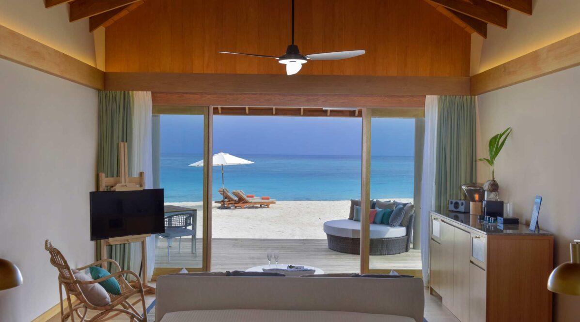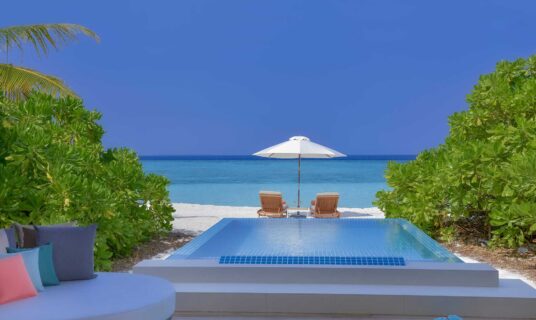 Two-bedroom beach villa with private pool (220 m²) – ideal for families, occupying separate twin and king rooms.