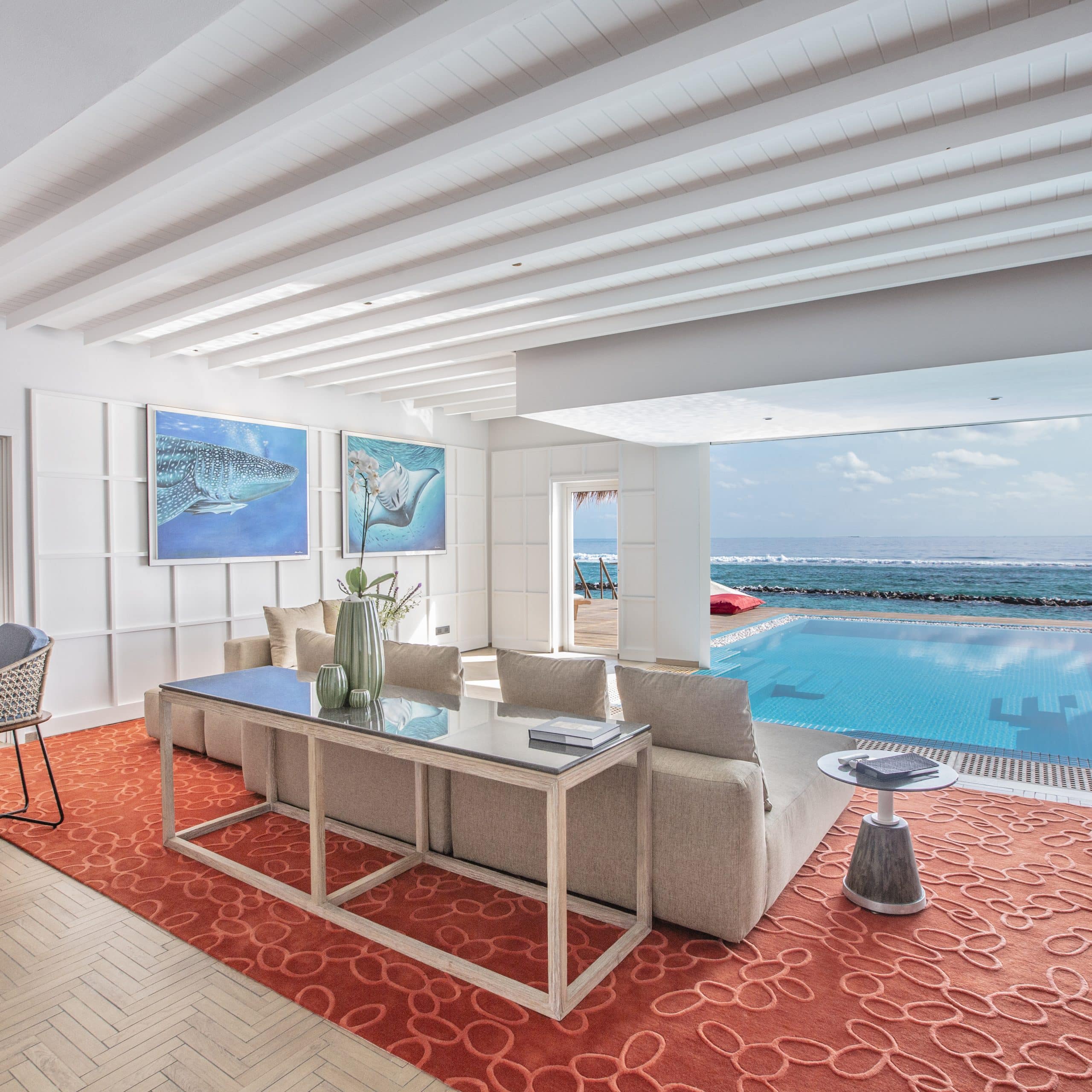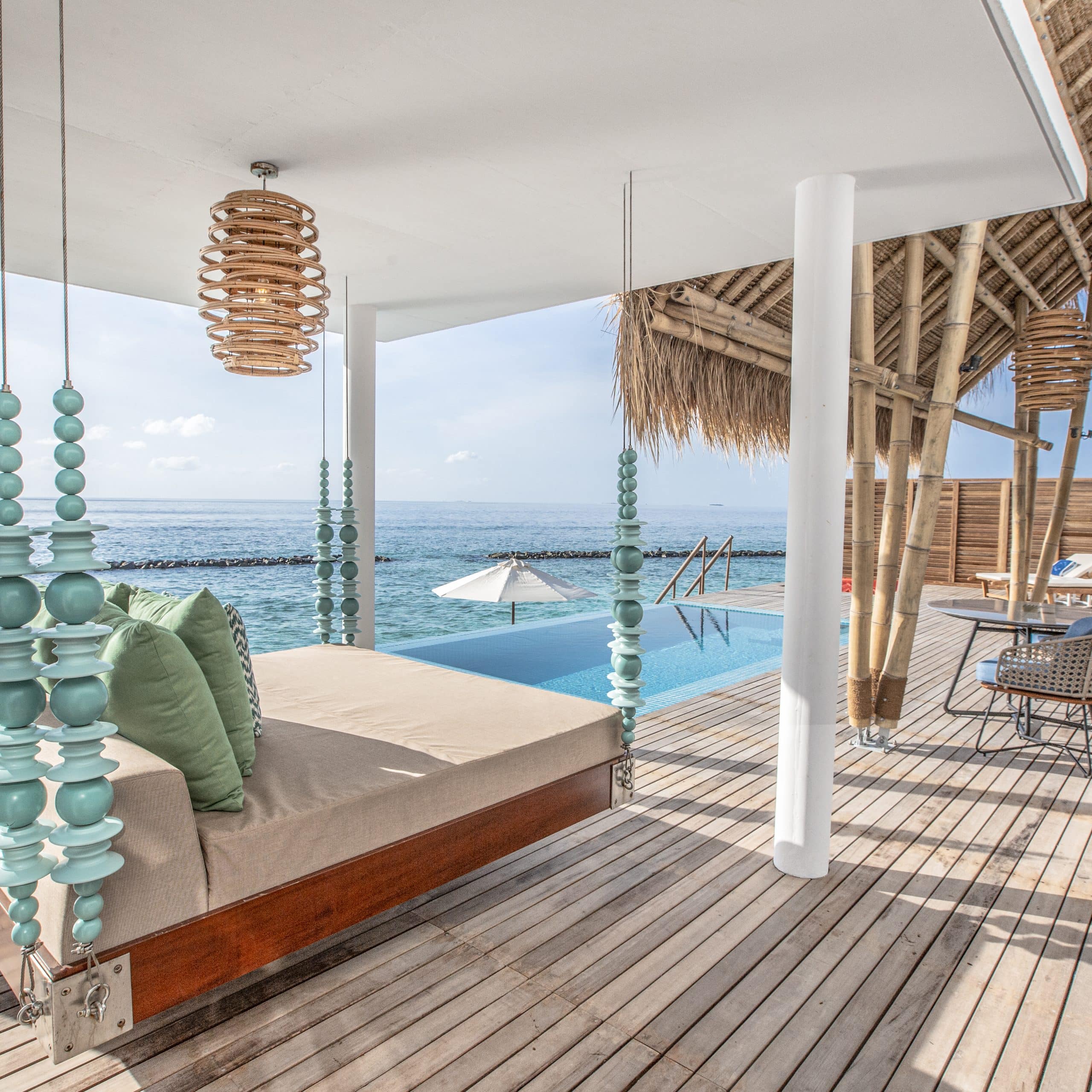 High‑end over‑water villa with lounge, large patio and pool (8 × 3 m).