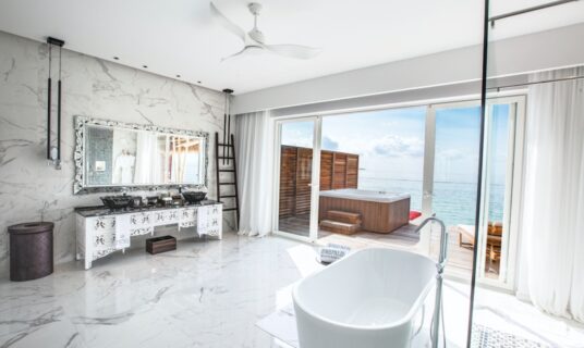 Spanning ~176 m², this over‑water villa features direct lagoon access and a private 2 × 2 m Jacuzzi on the deck, ideal for couples seeking privacy and indulgence.