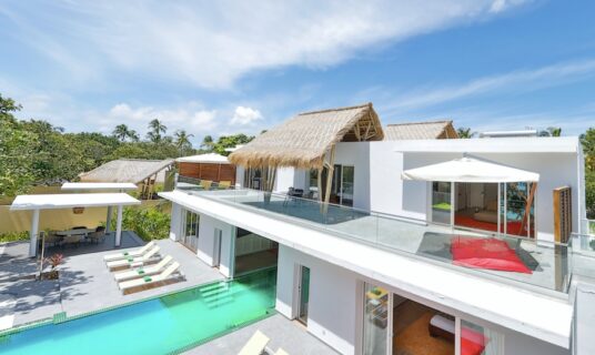 Royal Beach Villa (900 sqm) combining multiple bedrooms, living areas, bar/kitchen and ultra‑private pool.