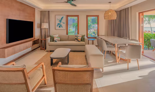 Escape to the elegance of the Beachfront Junior Suite, a luxurious haven designed for an unforgettable coastal retreat. Spanning, this spacious suite is ideal for couples, families, or groups, comfortably accommodating up to three adults or two adults and two children under 12. Wake up to mesmerizing views of turquoise waters from your private sanctuary, where the soothing ocean breeze sets the tone for relaxation.