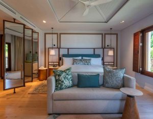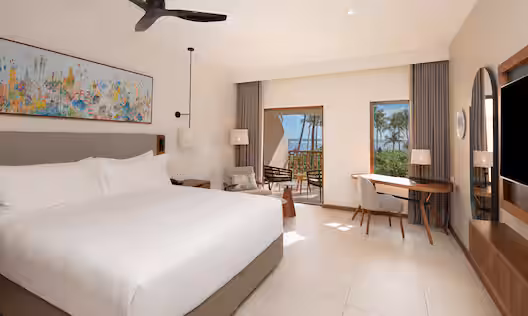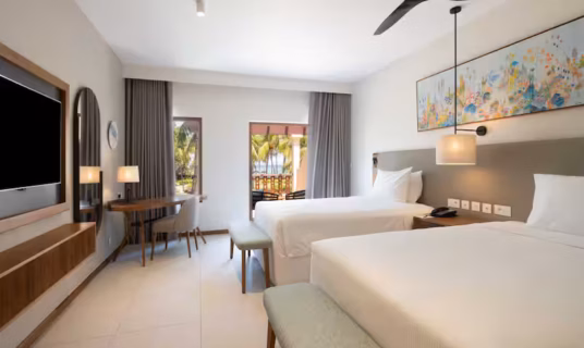 Hilton Mauritius Resort & Spa offers elegantly designed accommodations that blend contemporary comfort with tropical charm. Each room and suite features private balconies or terraces with stunning views of the Indian Ocean or lush gardens. Spacious interiors, natural wood accents, and soft tones create a serene retreat, while modern amenities ensure a luxurious stay. Whether you choose a stylish guest room or an opulent suite, every space is designed to enhance relaxation, with plush bedding, indulgent bathrooms, and a seamless connection to the breathtaking island surroundings.