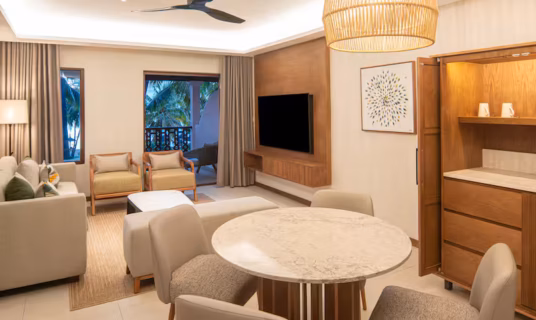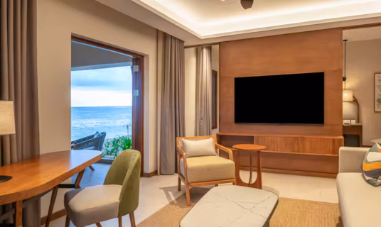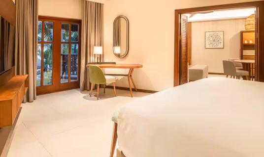 A contemporary room with direct beach access, private balcony, and serene lagoon views, perfect for couples or solo travellers.