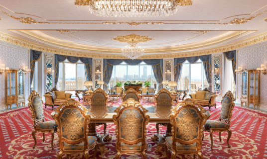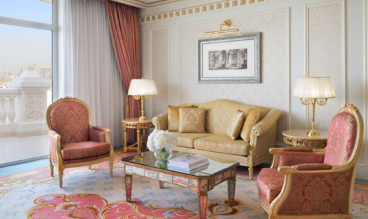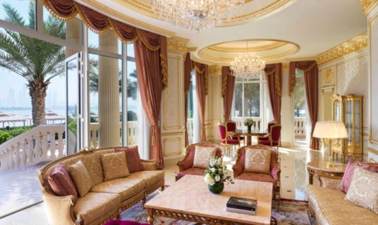 Adorned with chandeliers, plush carpets, and refined upholstery, this spacious suite offers separate living and sleeping areas, a private Jacuzzi, skyline or Arabian Gulf views, Raffles Club Lounge access, and elevated amenities for comfort and privacy.