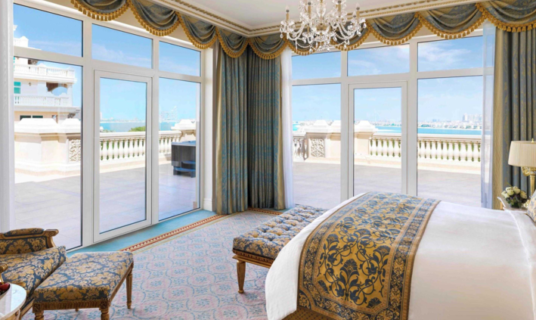 Palatial in style with glittering Palm views, this signature suite offers expansive living and dining rooms. Adorned with Francesco Molon furnishings, exclusive amenities, and Raffles Club Lounge access, it promises a glamorous escape steeped in elegance.