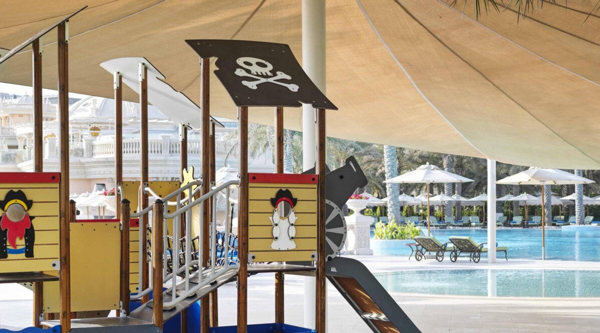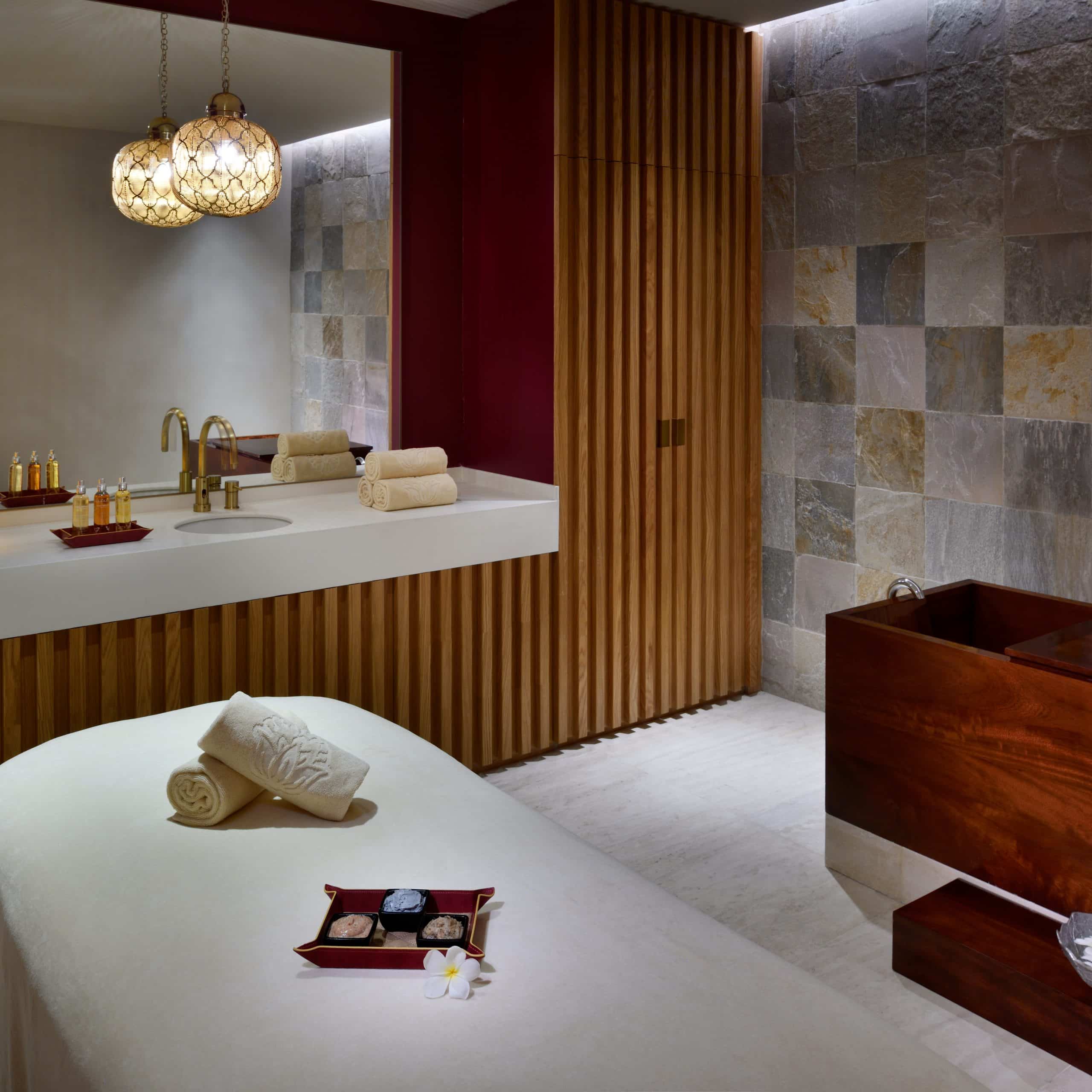 The Cinq Mondes Spa spans an impressive 3,000 sqm, offering 23 treatment rooms, two private spa suites, six scrub rooms and separate male and female hammams. Guests can unwind in one of the largest indoor pools on the Palm, while wellness facilities include a state-of-the-art gym, yoga studio, and a full hair and beauty salon.