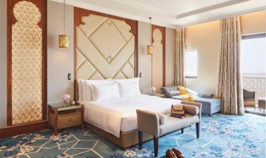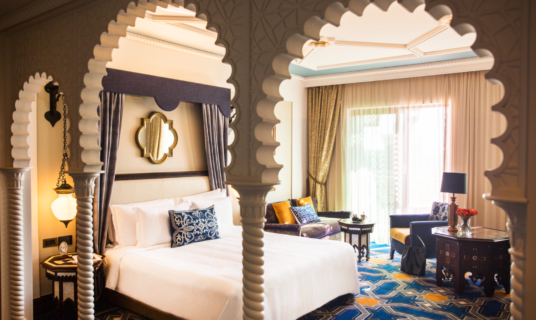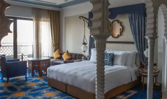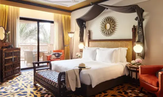 The Arabian Deluxe Room offers a serene retreat with elegant Arabian-inspired décor, a private balcony, and views over the resort’s lush gardens or tranquil waterways.