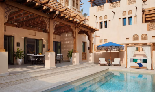 The most intimate of Madinat Jumeirah’s resorts, Jumeirah Dar Al Masyaf Madinat Jumeirah evokes the timeless glamour of a royal Arabian summerhouse. Traditional architecture with Islamic archways, beautiful wind towers and intricate domes make a stay at this hotel something truly special. With sweeping views of the sea, tranquil canals, peaceful courtyards and pockets of manicured gardens, each Malakiya Villa comes with its own private plunge pool and personalised and attentive butler service. Guests can get around on foot, golf buggy or by traditional abra boats to reach the landmarks of the greater resort – a choice of 50 restaurants and bars, a series of hidden swimming pools and the indulgent Talise Spa await.