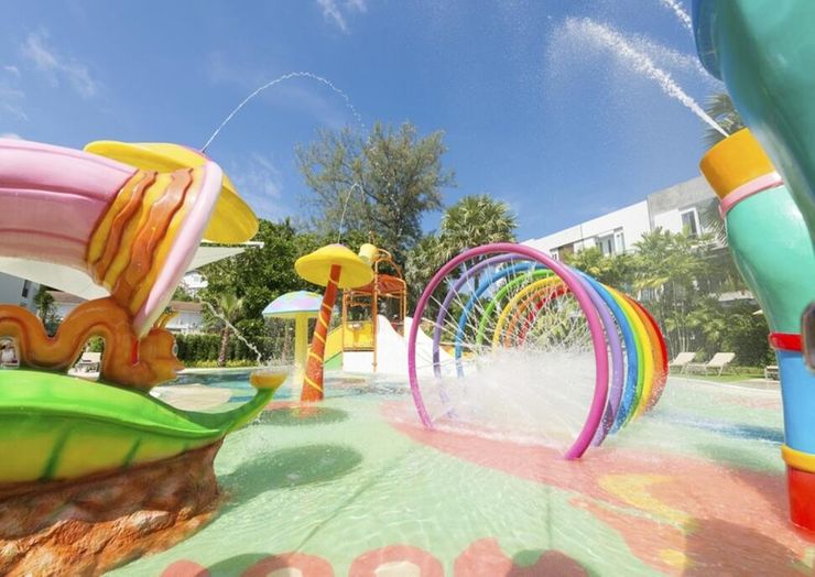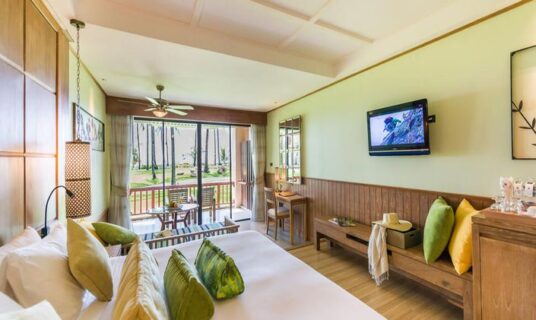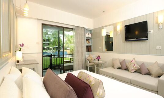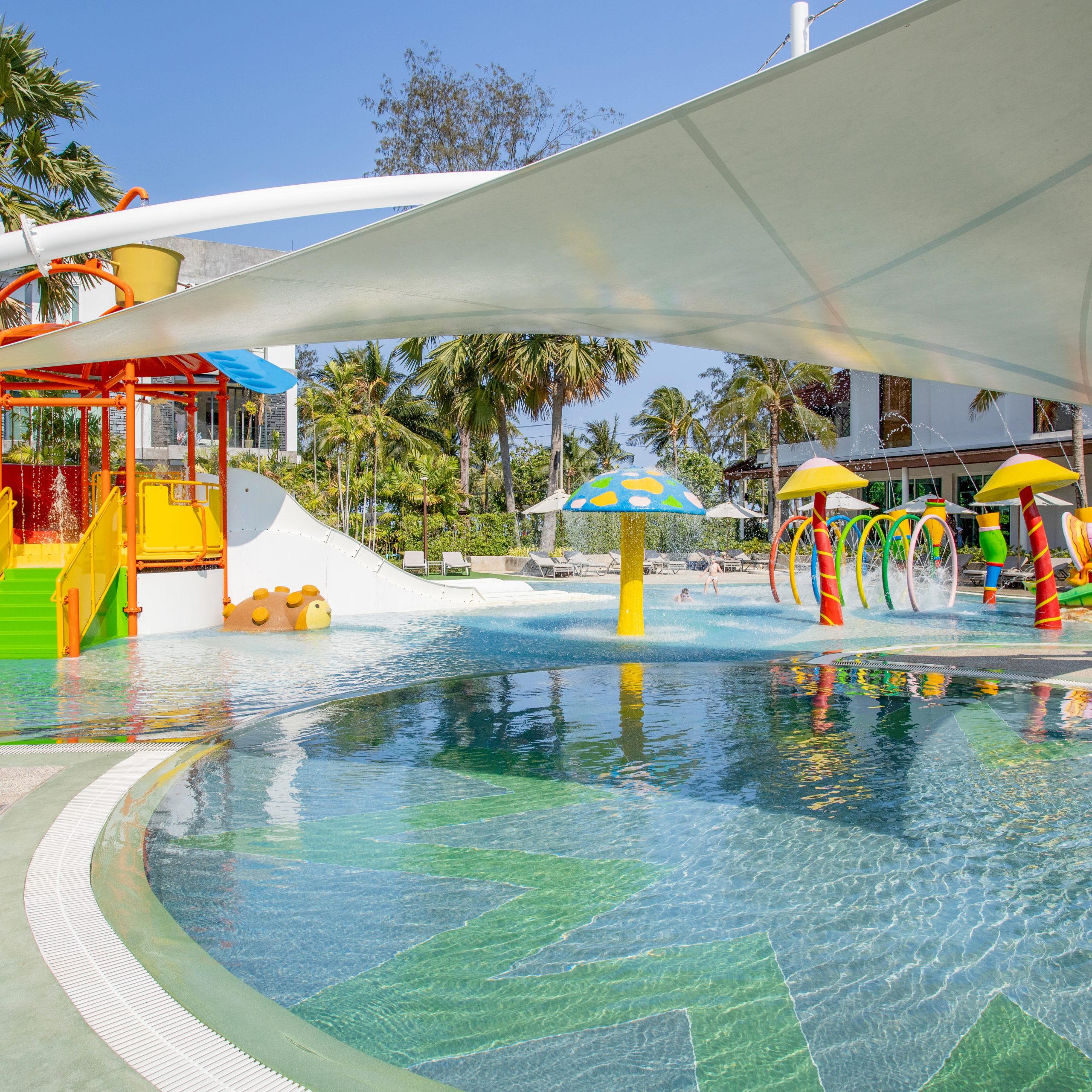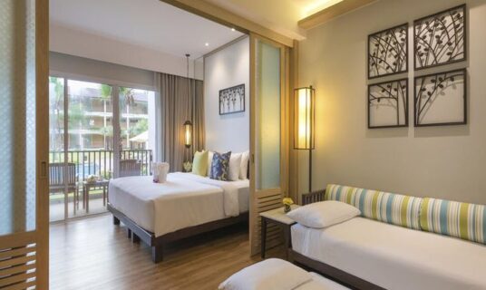 The Grand Deluxe room features a sliding door to separate the adult bedroom from the kids’ bedroom. The adult area is located next to an extra large balcony for guests to enjoy a lush garden view from this family accommodation in Phuket. The kids’ bedroom is well appointed with two trundle beds for comfort. The bathroom is equipped with a bathtub and separate shower. This room is ideal for families due to its close proximity to the Joy Zone, games room and water slide to add the fun to your special family getaway!