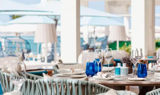 A stylish, beachfront day-to-night venue offering poolside cocktails, light Mediterranean bites, and DJ-curated music in a vibrant seaside setting.