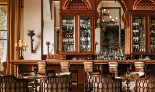 An elegant lounge offering signature teas, coffee, and light refreshments in a sophisticated Arabian-inspired setting.