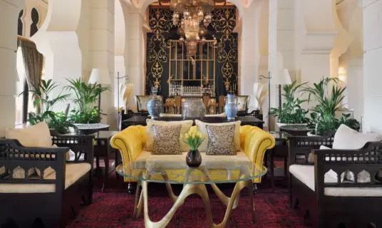 An elegant lounge offering afternoon tea and light refreshments in a plush Arabian-inspired setting.