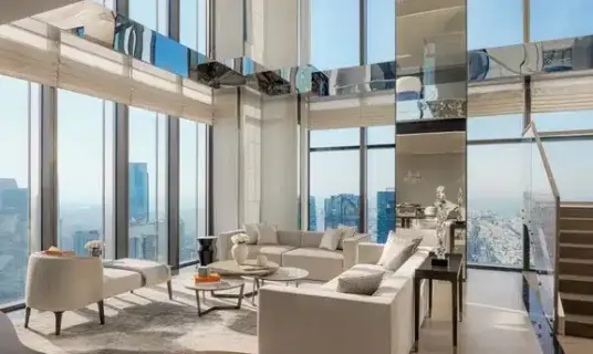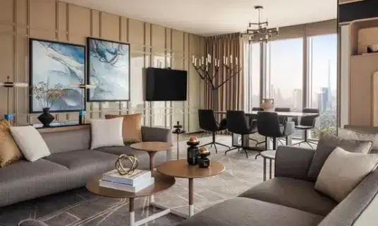 Set over two storeys, this loft-suite maximises space and privacy. Soak in spectacular views of Dubai with double-height windows in the living and dining room. Upstairs, a king-sized bedroom, stunning bathroom and workspace await.