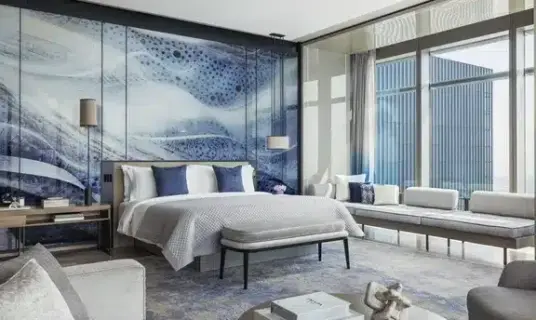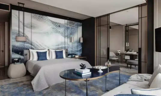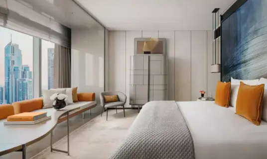 Expansively proportioned, these generous guest rooms are among the very largest in Dubai. They offer a choice of king or double queen beds, an elongated daybed, walk-in wardrobe with dressing room, and a spa-like bathroom with a standalone bathtub boasting uninterrupted city vistas.