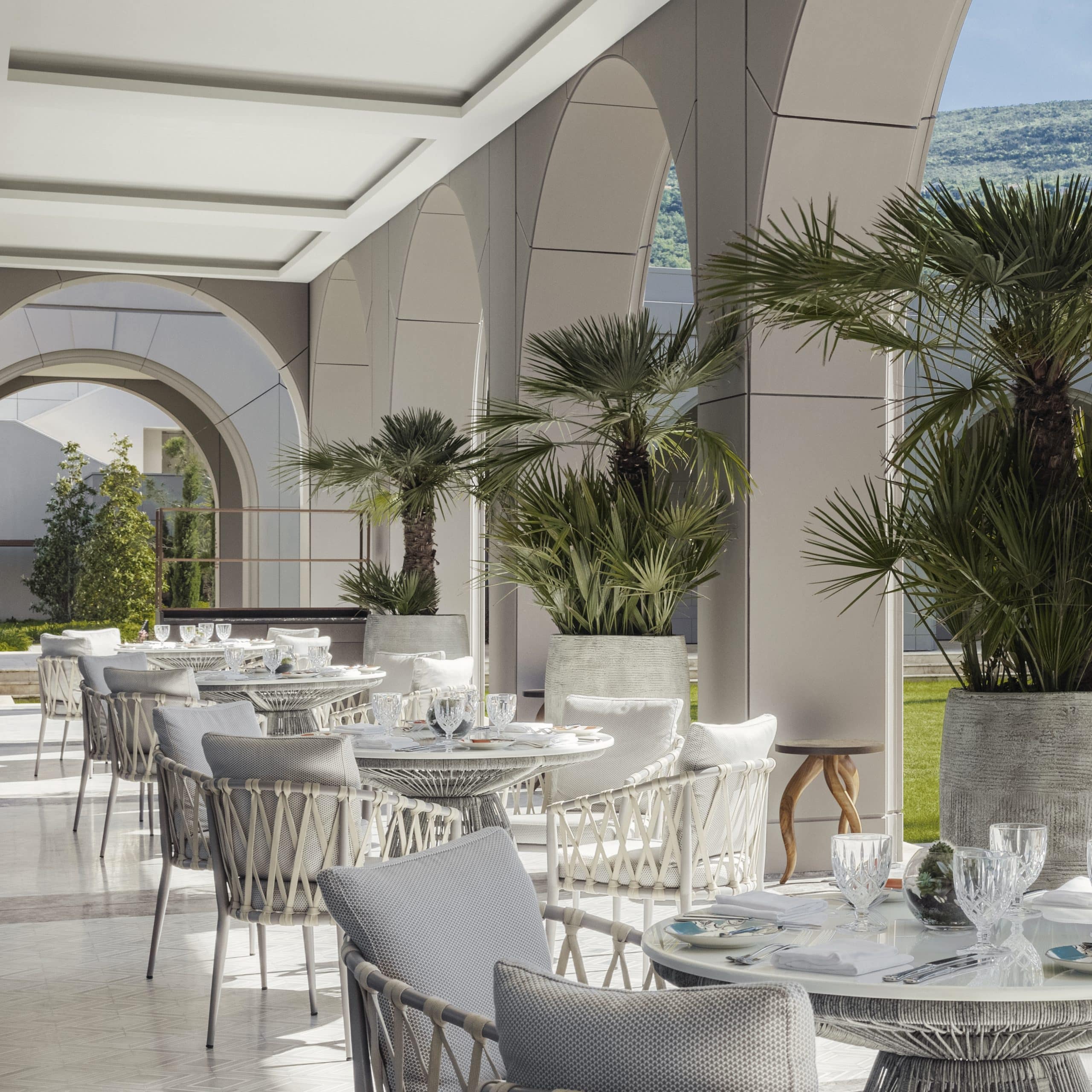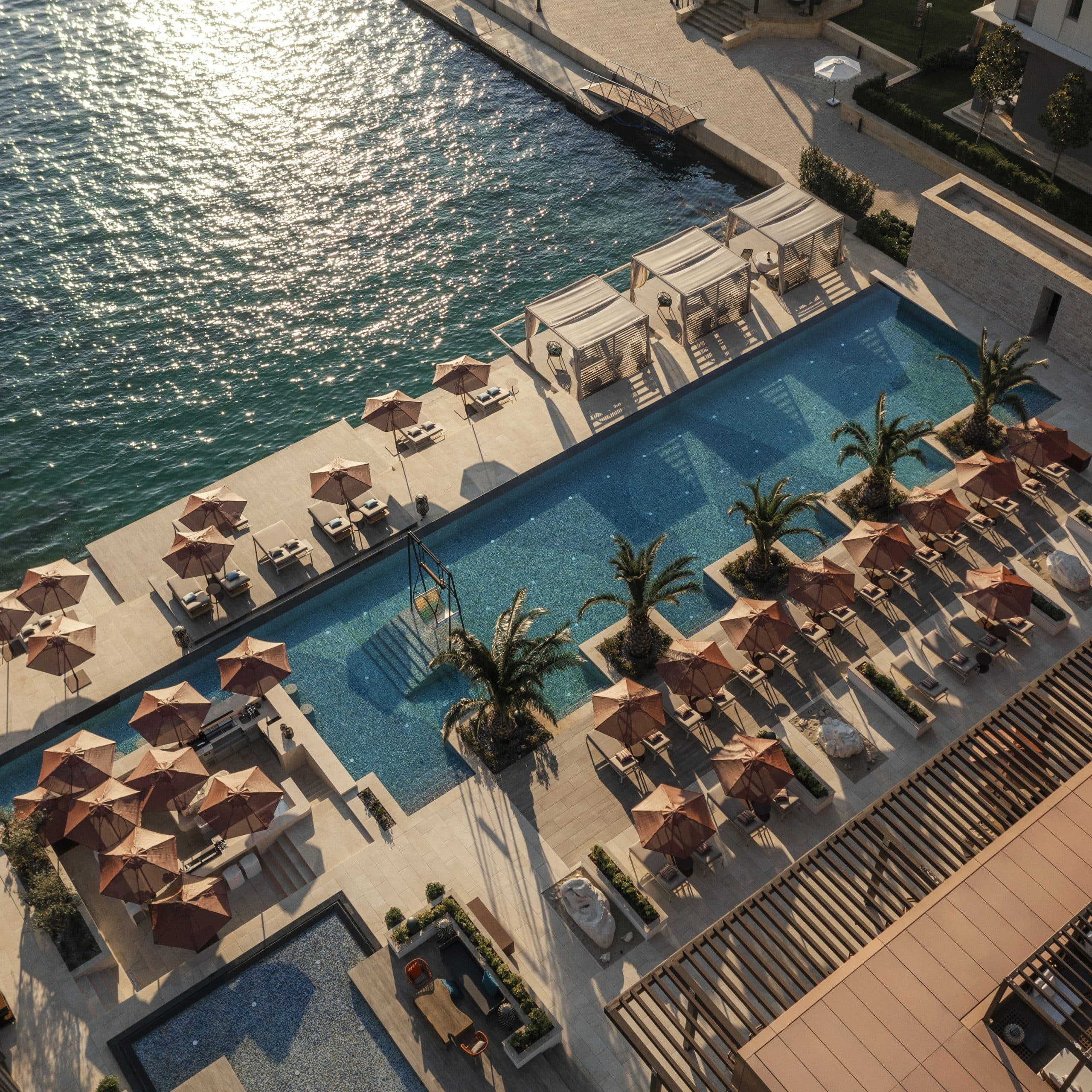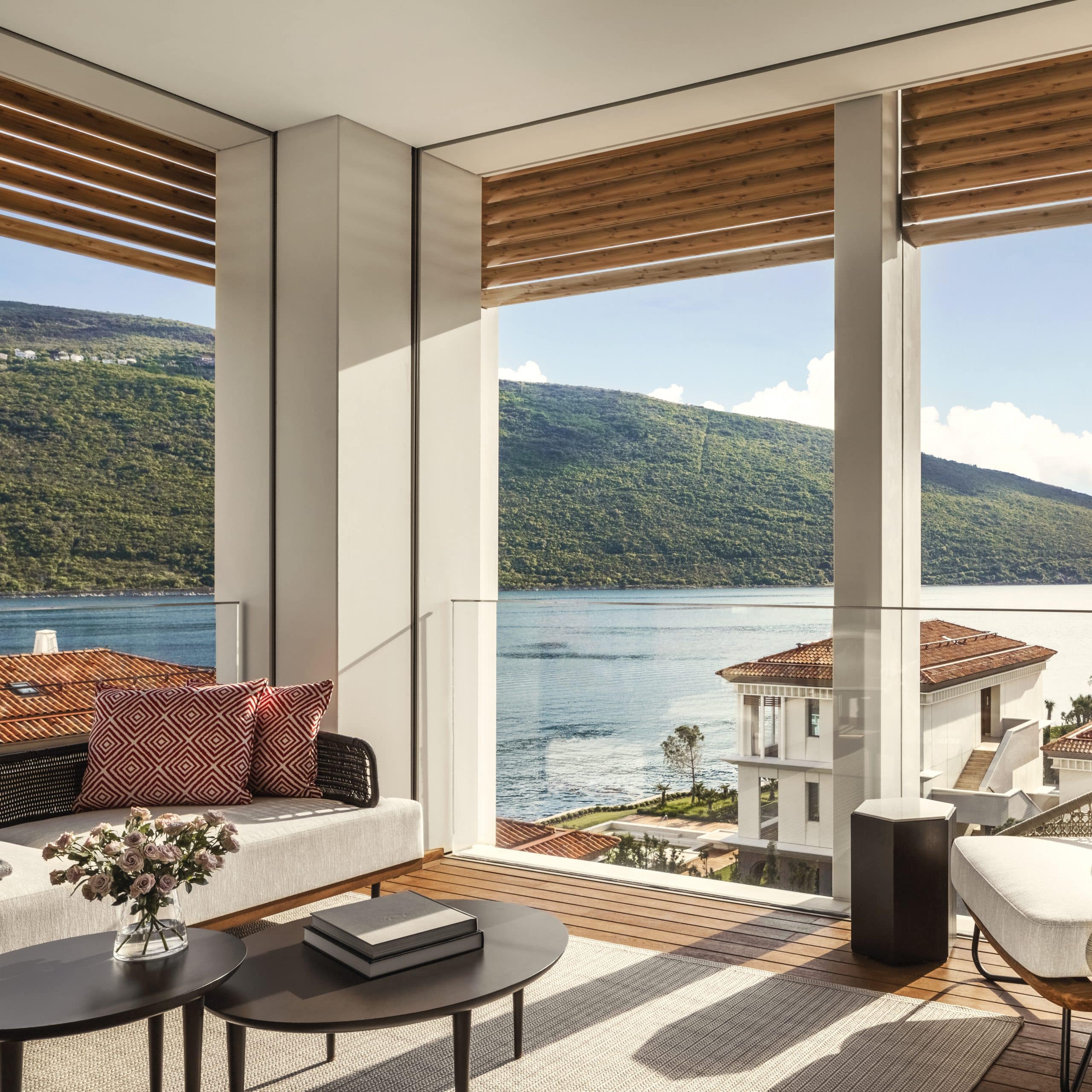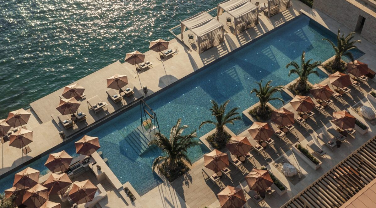 The design at One&Only Portonovi honours the region’s natural beauty — interiors bathed in soft Mediterranean tones, with floor-to-ceiling windows, private terraces, and spacious bathrooms.