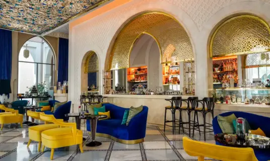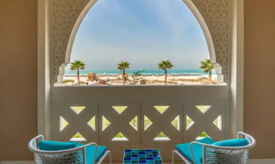 Rixos Premium Saadiyat Island offers luxurious accommodations on Saadiyat Island, Abu Dhabi. The resort features elegant rooms and suites with modern amenities, private balconies, and stunning views. Guests can enjoy access to the private beach, multiple swimming pools, and diverse dining options, creating a lavish and relaxing stay. The decoration combines contemporary style with Middle Eastern influences, providing a sophisticated atmosphere for guests to indulge in a premium resort experience.