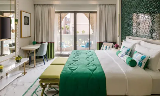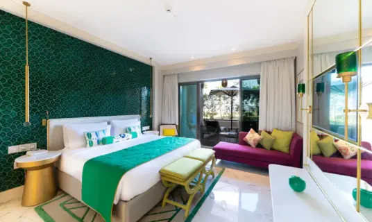 A Mediterranean‑inspired room with a king‑size bed, ideal for relaxing while overlooking lush gardens.