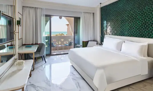 A sea‑view deluxe room offering sweeping vistas of the Arabian Gulf from a comfortable king‑bed room.