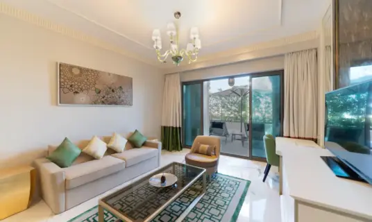 A regal 2‑bedroom suite with marble floors, ornate décor and expansive living space for an indulgent stay.