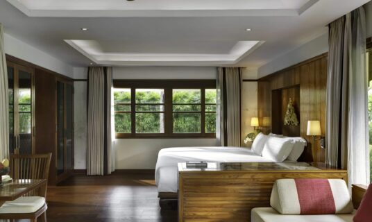 A serene villa tucked into tropical gardens, with a private terrace, wooden interiors, and Thai-style décor.