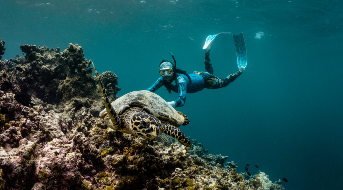 Fresh food made with local ingredients is guaranteed to make your mouth water at Finolhu. If you’re lucky, you’ll have front-row seats at Beach Kitchen to groups of dolphins who can often be seen playfully leaping out of the water. International dishes are prepared here every day, buffet-style, catering to a range of dietary needs. Award-winning Japanese restaurant Kanusan is the go-to for a romantic fine dining experience due to its atmospheric lighting and enchanting energy – perfect for an anniversary, date night or even a proposal. Simplicity is key at Crab Shack, who are pros at beachside dining and partying. Take a 20-minute stroll across the sandbank or a 5-minute ride in the resort’s traditional wooden boat, soaking in the wonders of turquoise waters.