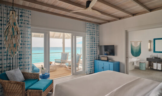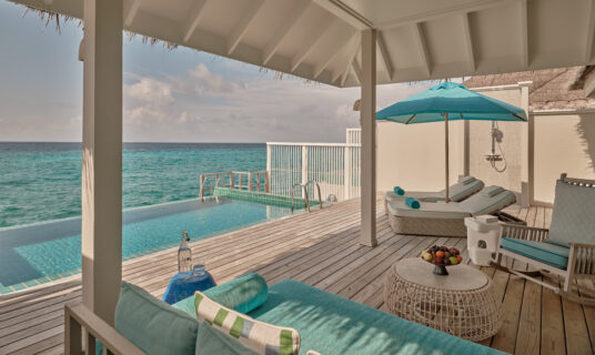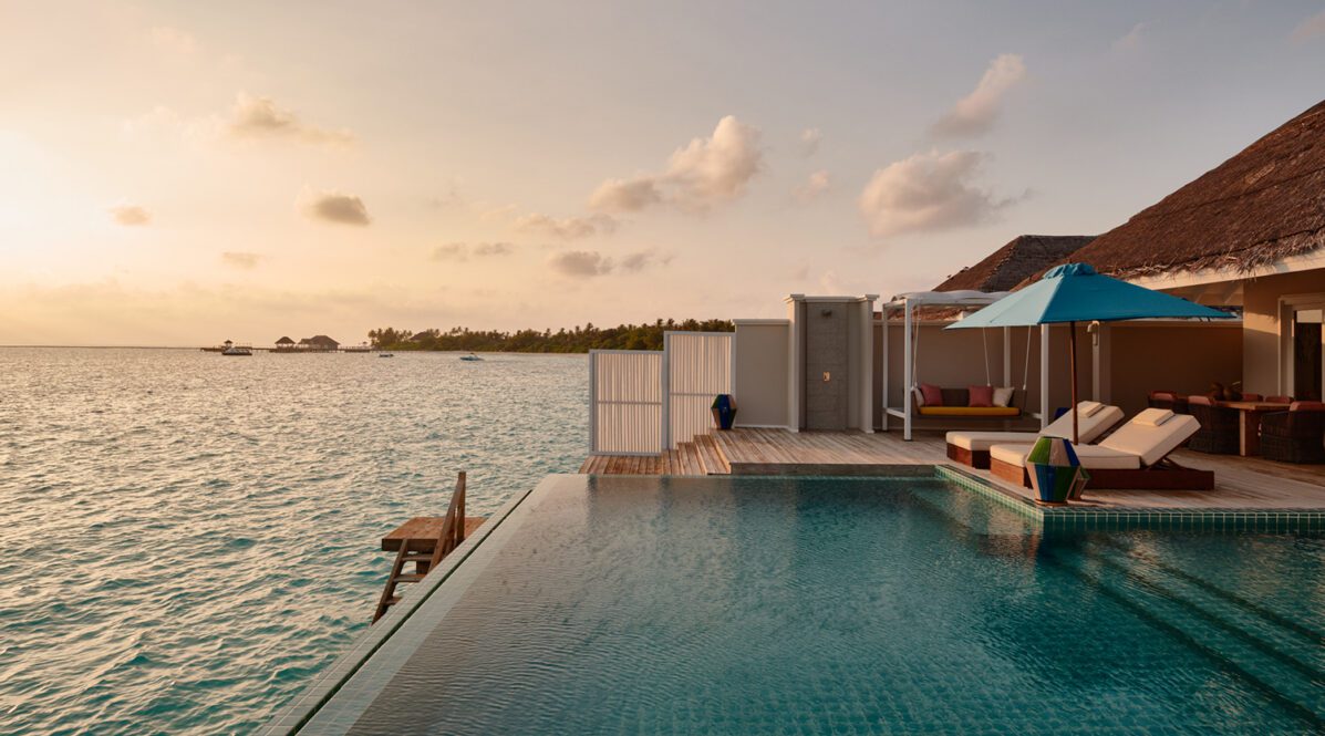 An over‑water villa combining private infinity pool, ocean access and sunset views.