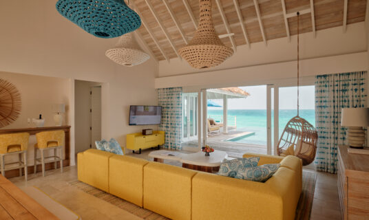 An over‑water villa with two master bedrooms, living area and a large private pool.