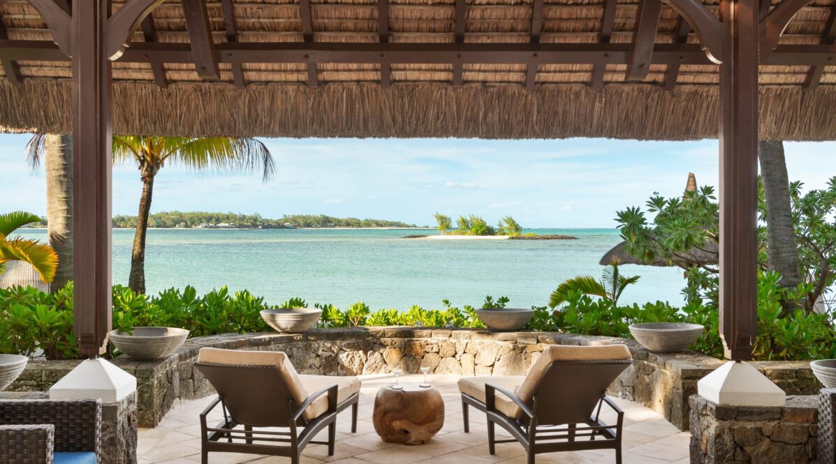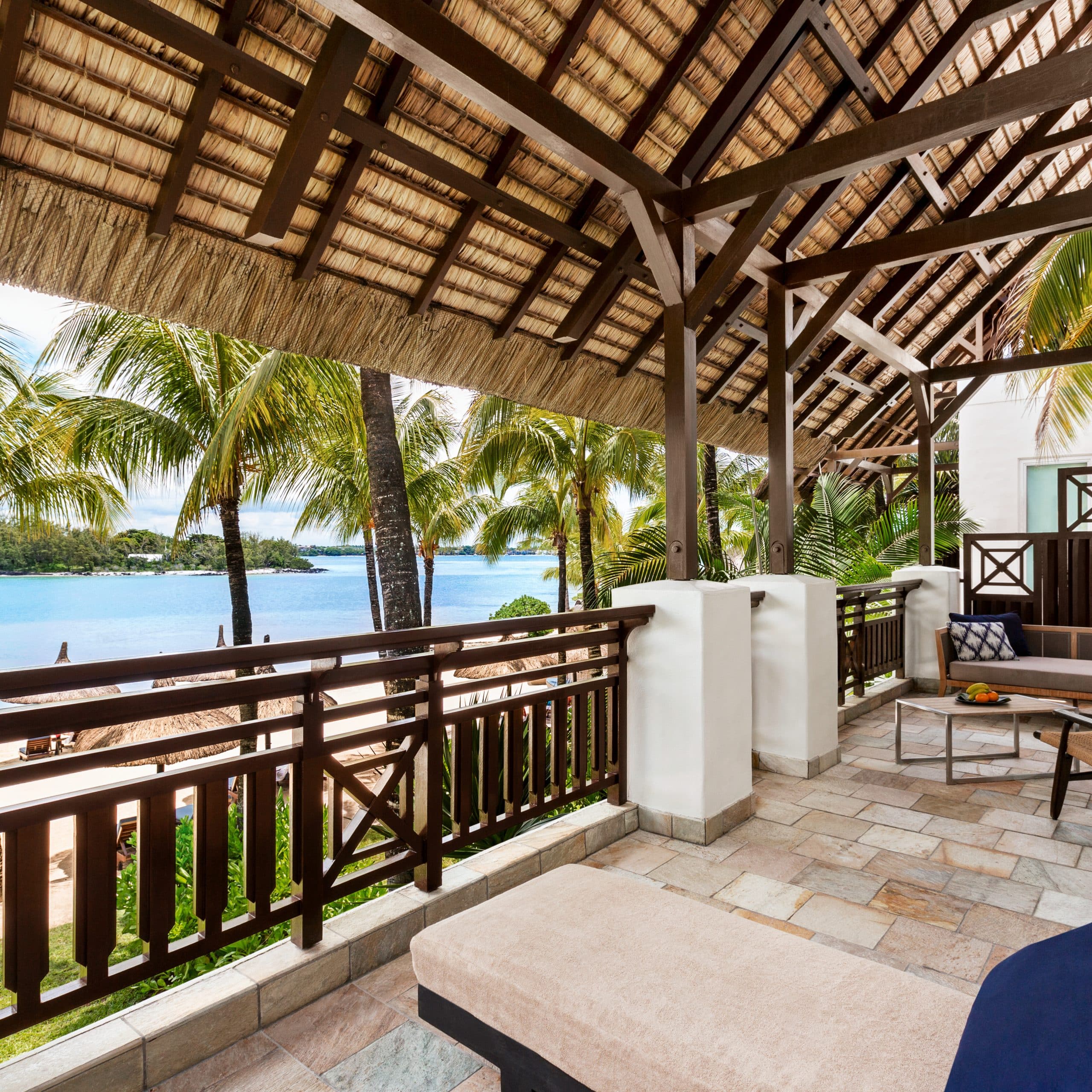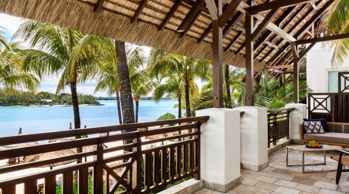 A suite with a furnished balcony overlooking the Indian Ocean.