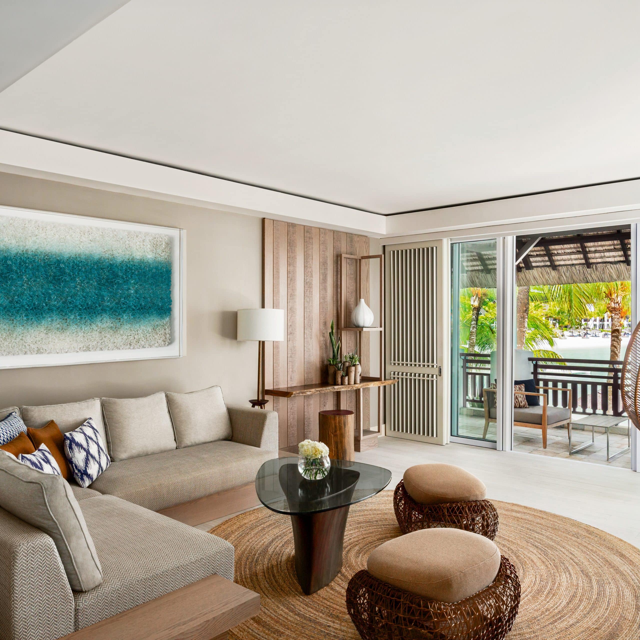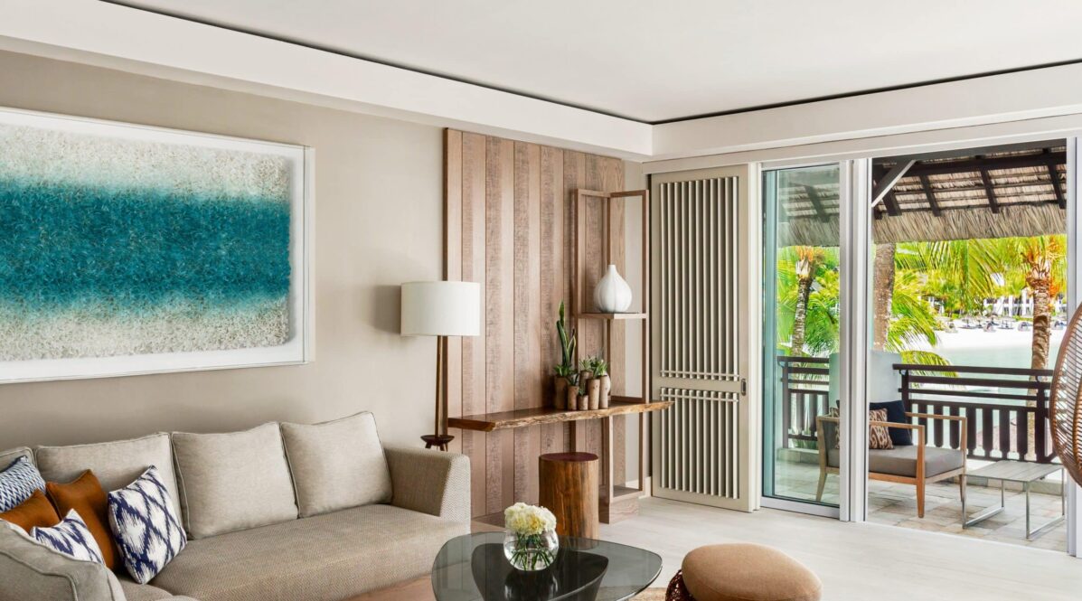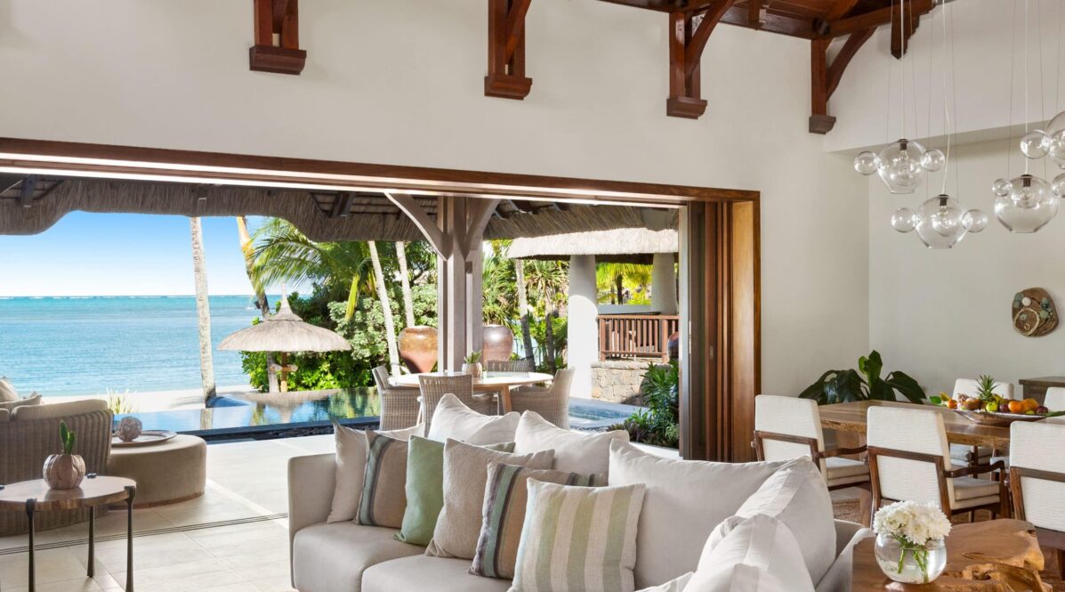 A luxurious beachfront suite with separate living space and direct sea access.