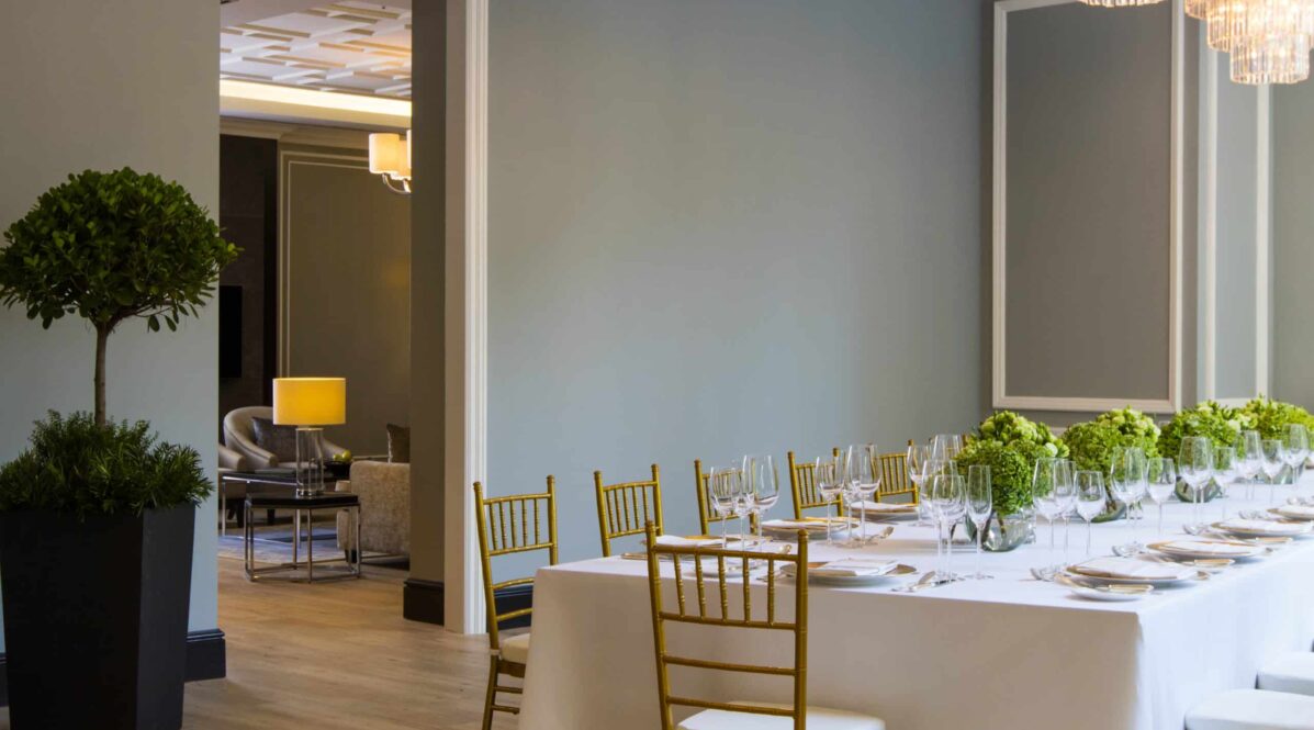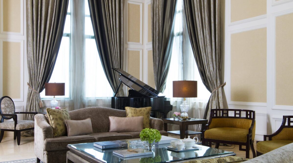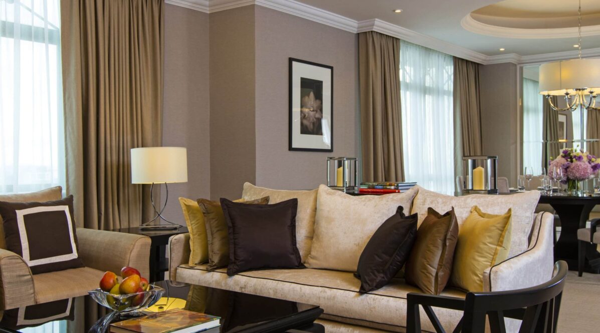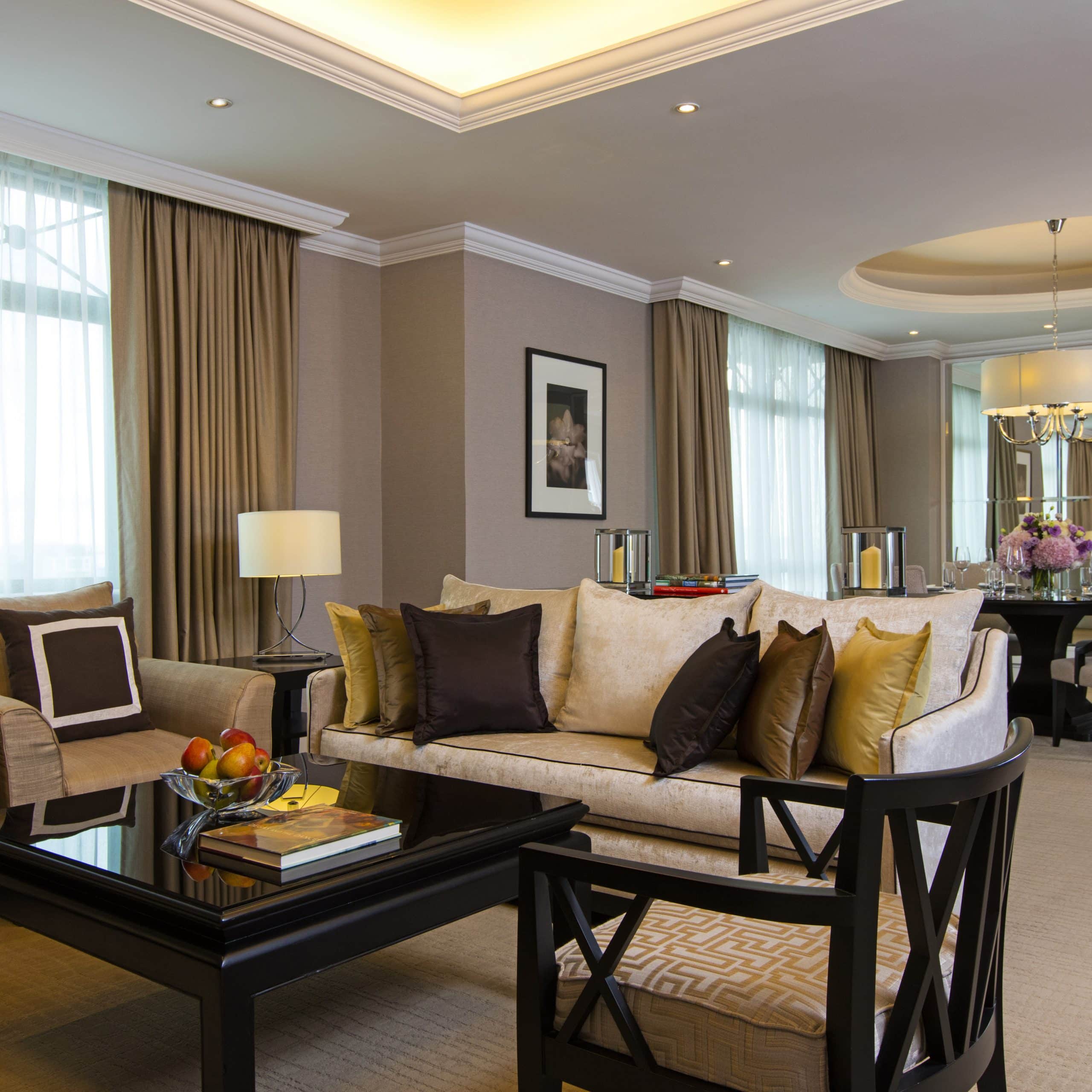 A sprawling suite with three separate bedrooms (king, twin, and double), city views, full marble bathrooms, a living area, powder room and full butler service.