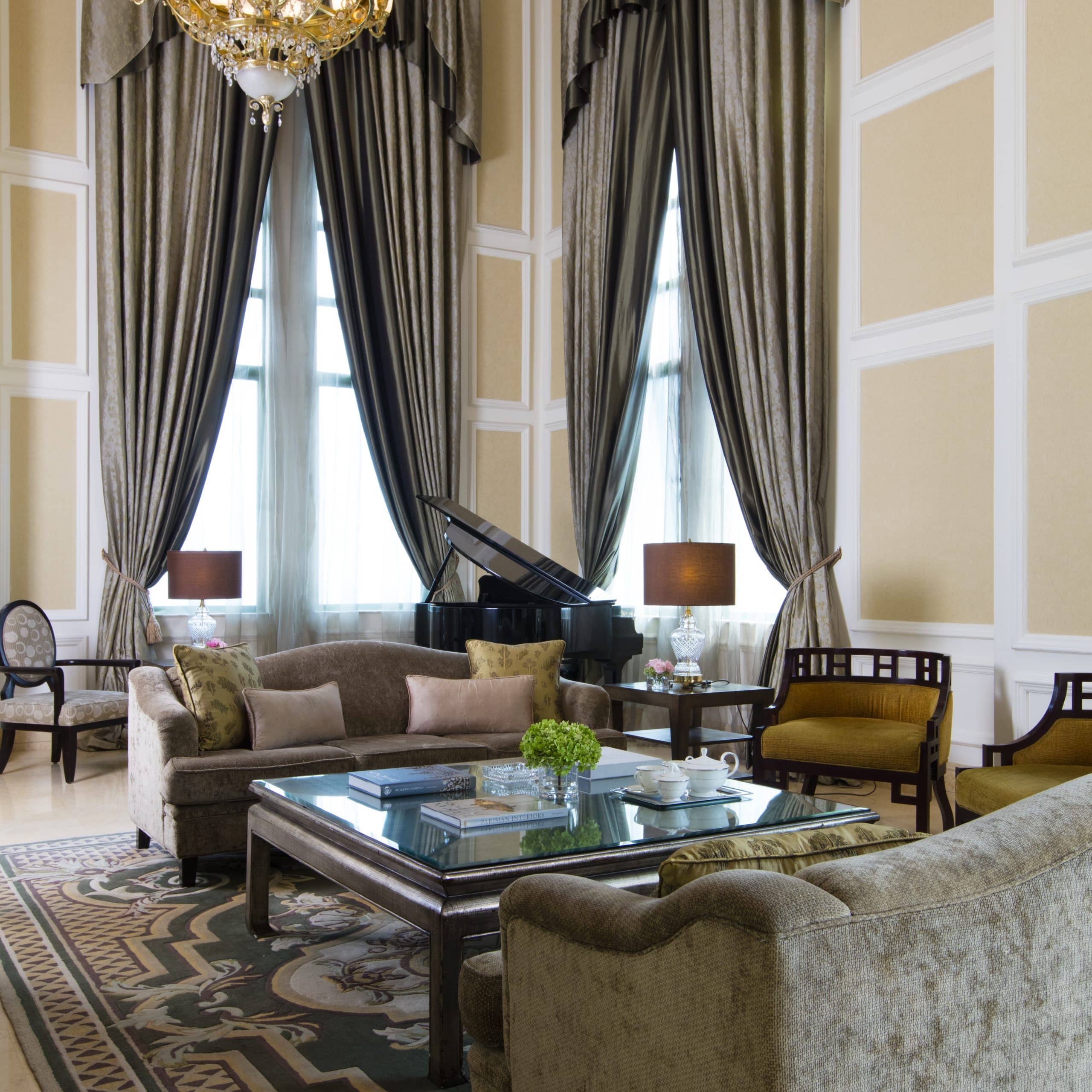 A sumptuous suite with a king bed, city views, a grand living area, powder room, full butler service, and Asprey bath amenities.