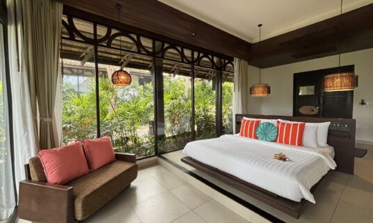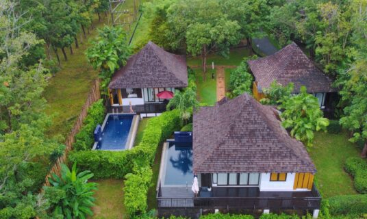 The three expansive single-story villas offer a master bedroom with an ensuite bathroom featuring a sunken Jacuzzi and separate rain shower. The king-sized bedroom opens to a living room with views of the private pool. Across the terrace, you’ll find a second bedroom with twin beds and an additional bathroom with a rain shower. These villas also include a large terrace and a spacious 10-metre private pool, perfect for relaxation