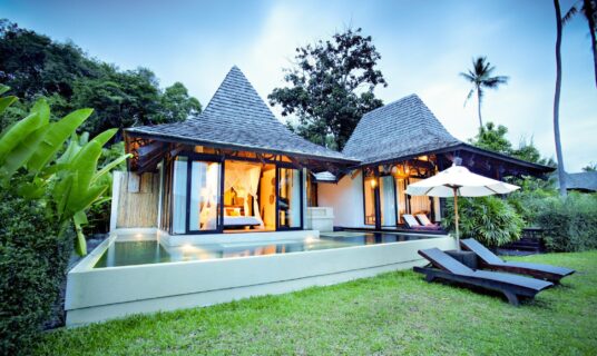 The four luxurious single-story villas are nestled along the beachfront, featuring a spacious bedroom and a stylish bathroom equipped with a bathtub and outdoor shower. Each villa boasts two terraces and an impressive 11-metre infinity-edge pool with an integral Jacuzzi. The separate living room opens up to expansive private gardens that lead directly to the beach, offering an idyllic setting for relaxation and enjoyment