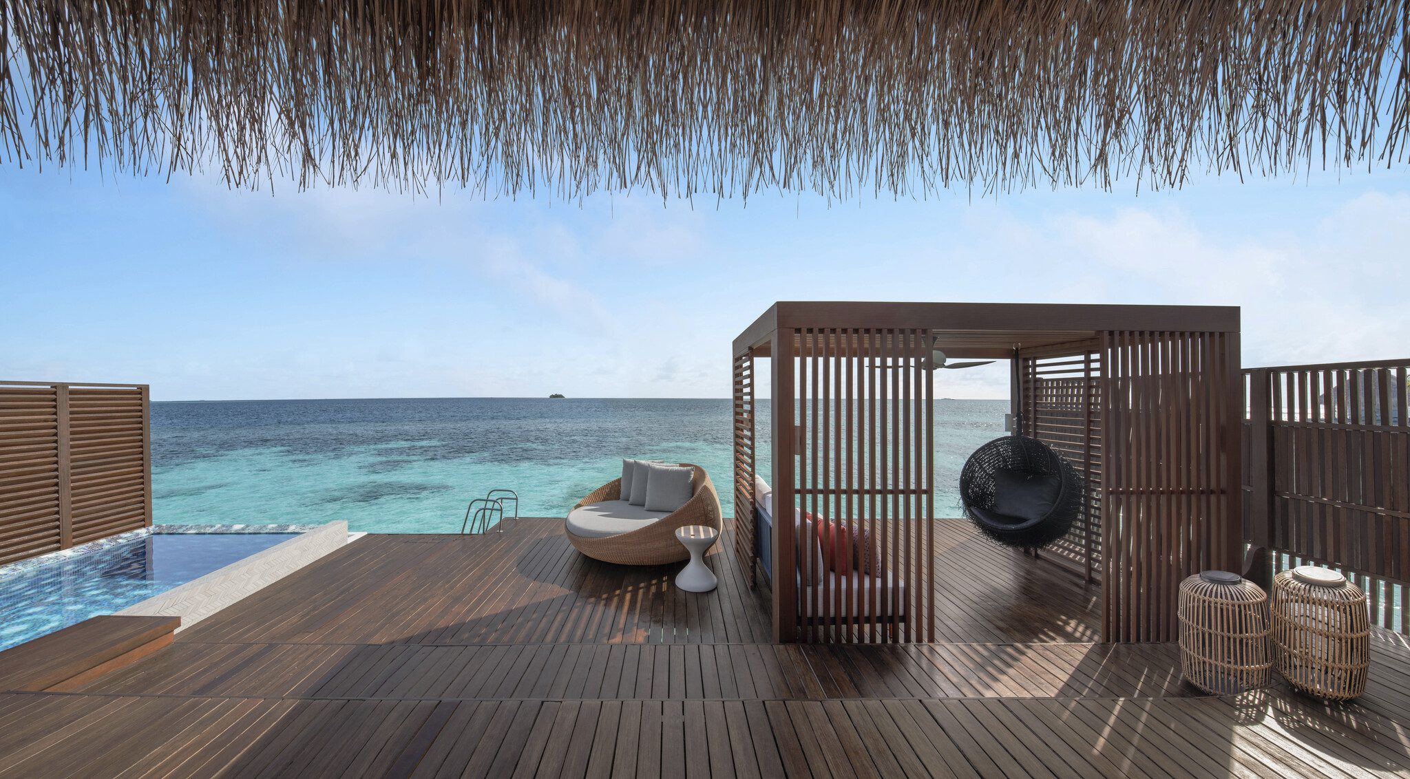 A sleek overwater retreat perched above the lagoon, combining direct water access with contemporary design and a private plunge pool.