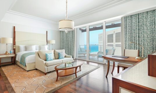Offering uninterrupted views of the azure blue Arabian Gulf and boasting an incredible 100 sqm of exquisite bedroom and living space, the Deluxe Suite is ideal for those guests who appreciate the luxury of space. The balcony is equally spacious and stylish, the ideal place to relax and marvel at the spectacular skyline, a sight that will stay with you forever. Rooms are suitable for up to four people four people and interconnecting rooms are subject to availability.