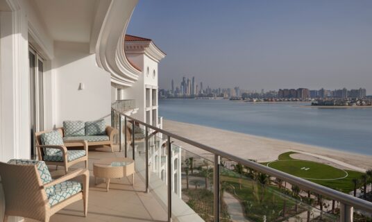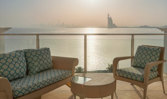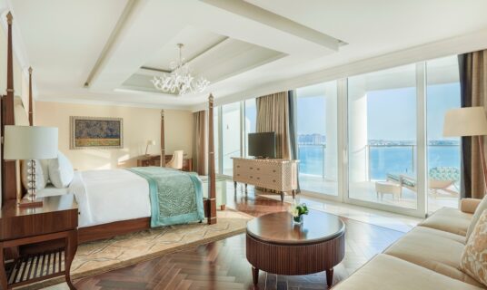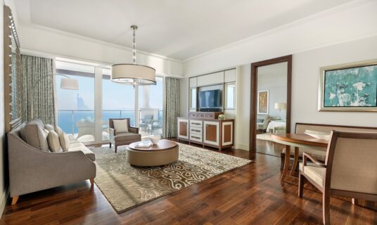This suite opens into an opulent foyer connecting to a lavish living space with a lounge, dining room and kitchen. A separate office adds to the presidential features. Two exquisite bedrooms open to a generous balcony with breathtaking views of the Arabian Gulf, making this a comfortable choice for up to five discerning guests.