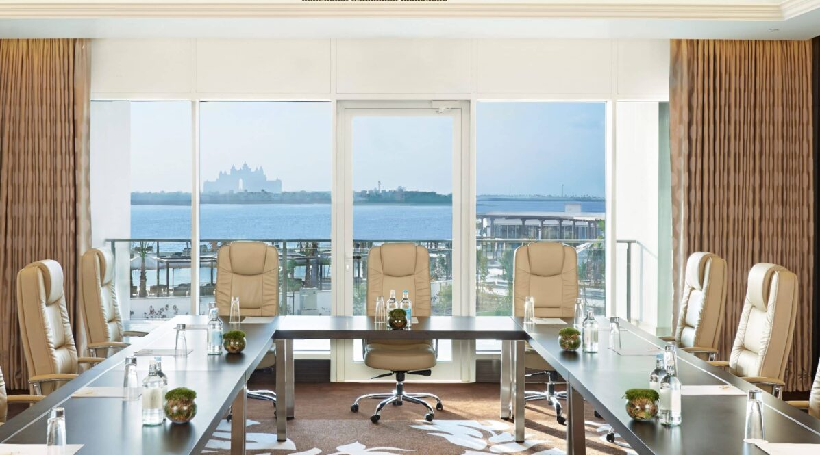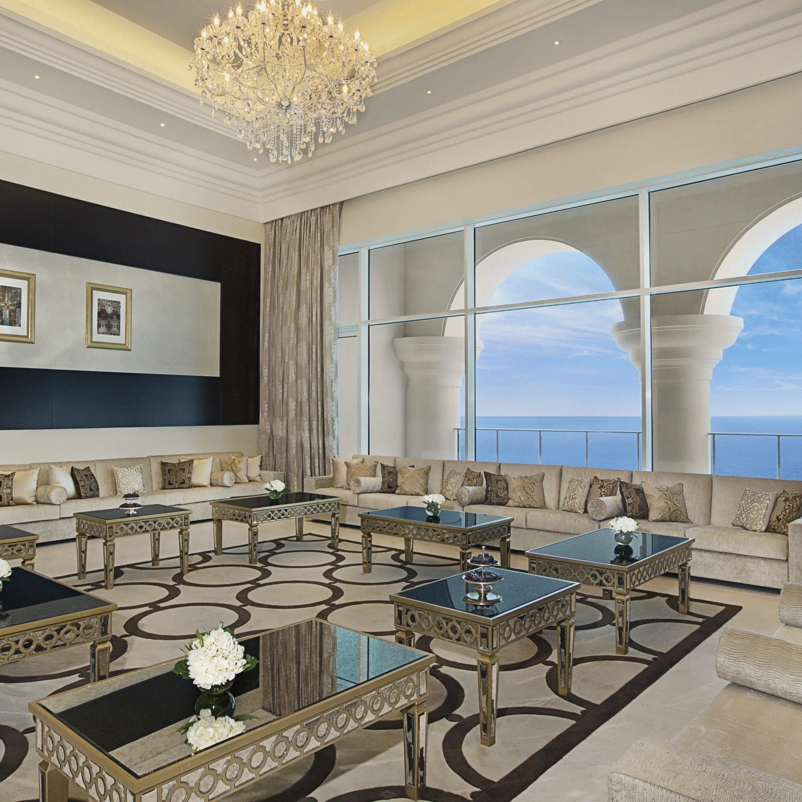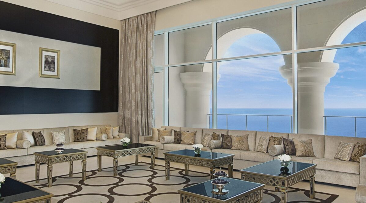 360-degree view of the Arabian Gulf. Two floors of generous luxury and refined sophistication with a private lift, Jacuzzi, gym area and “Majilis”, an Arabic seating area, which are unique to this suite. The 360-degree view of the Arabian Gulf is a sight that is sure to last a lifetime for guests. The Royal Suite comfortably hosts six guests in three separate bedrooms.